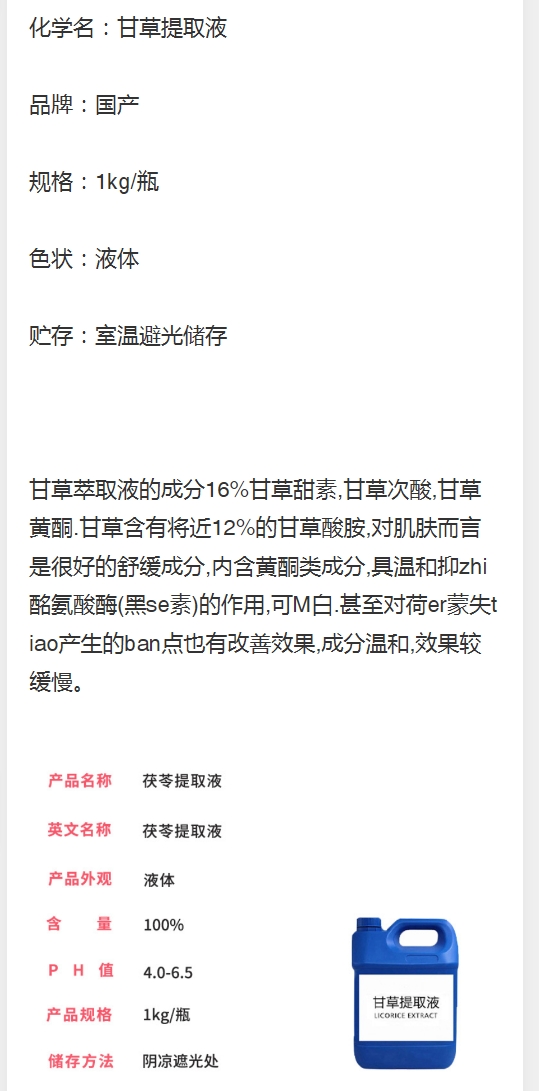 国产 甘草提取液 甘草萃取液 美白 祛斑舒 缓肌肤 化妆品原料 1kg